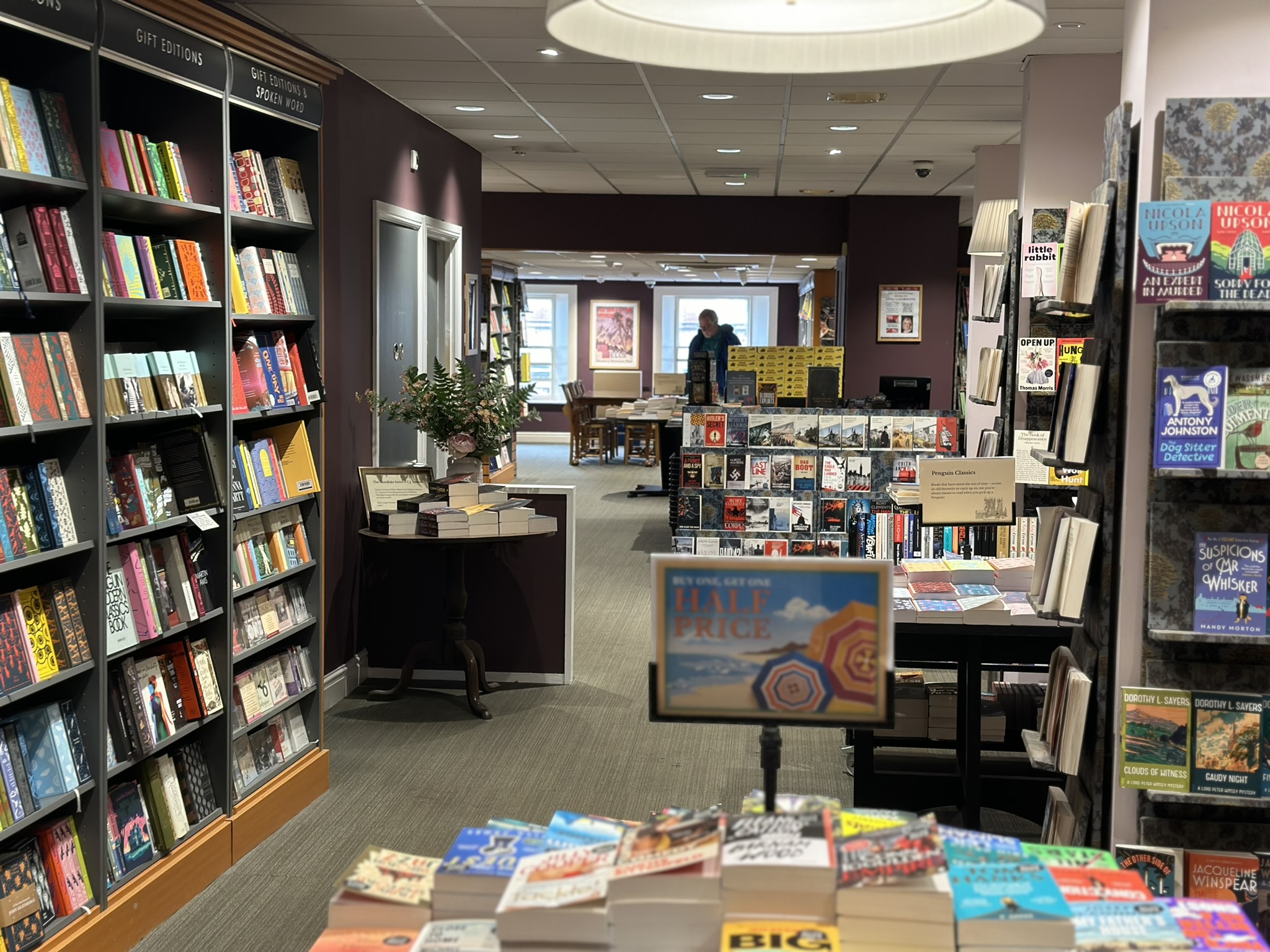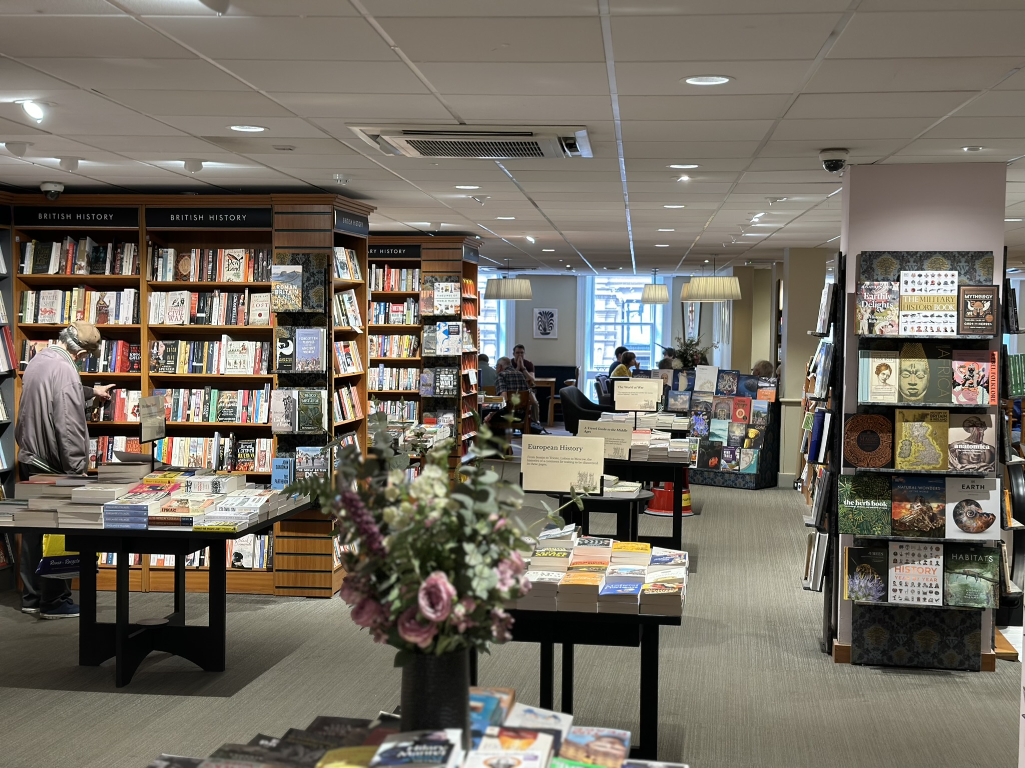 The first floor is largely split evenly between the cafe and non-fiction books, although the boundary is nicely fluid, with some tables close to book stacks. The cafe gets the front and the large windows. It is operated by Waterstones and has a good selection of cakes and pastries but the coffee comes only in a single size which is too small for my preference! The Waterstones loyalty scheme covers all purchases, including the cafe, books and on-line purchases and is fairly generous, going a considerable way to making up for sometimes cheaper prices on Amaazon.