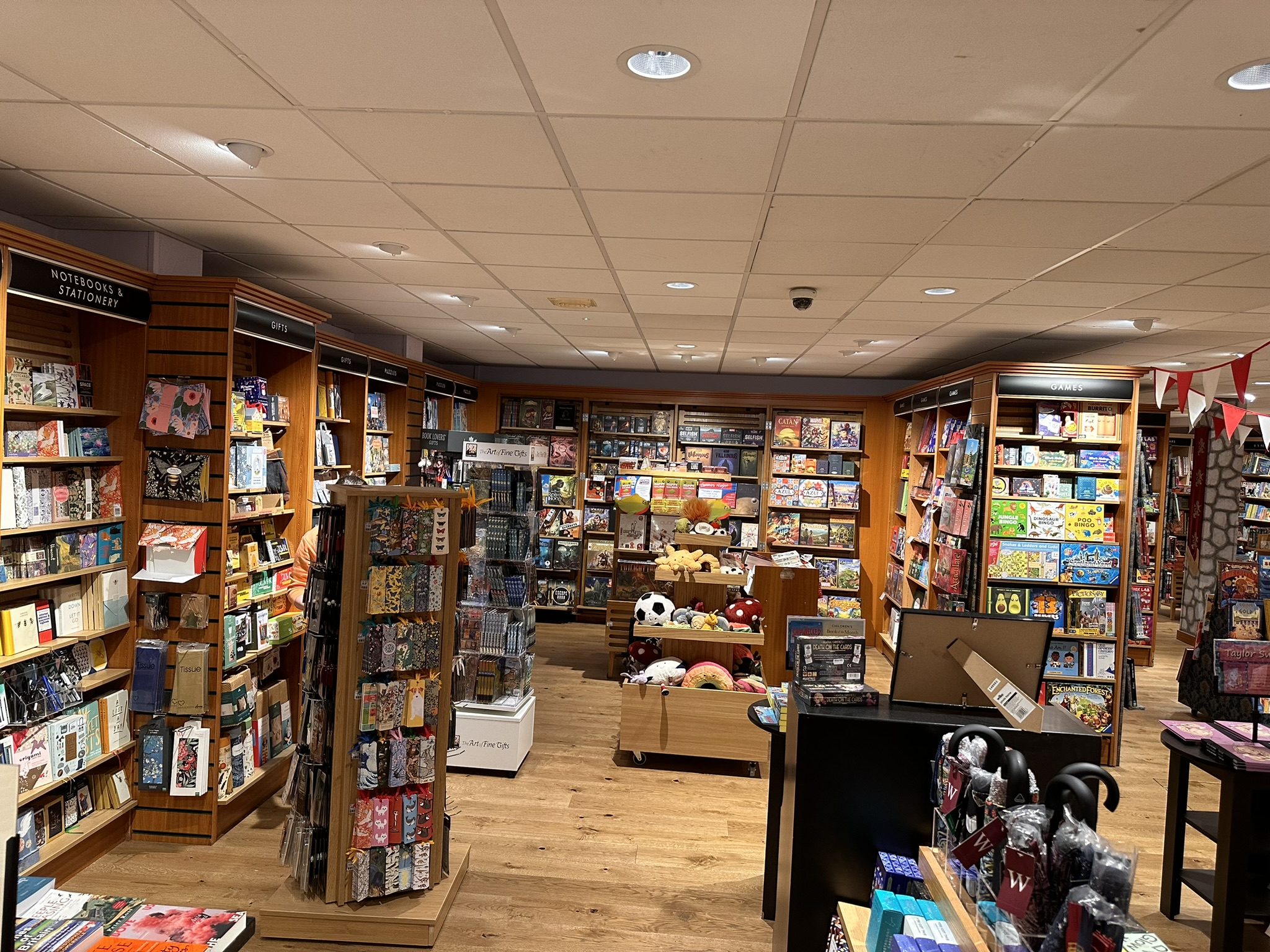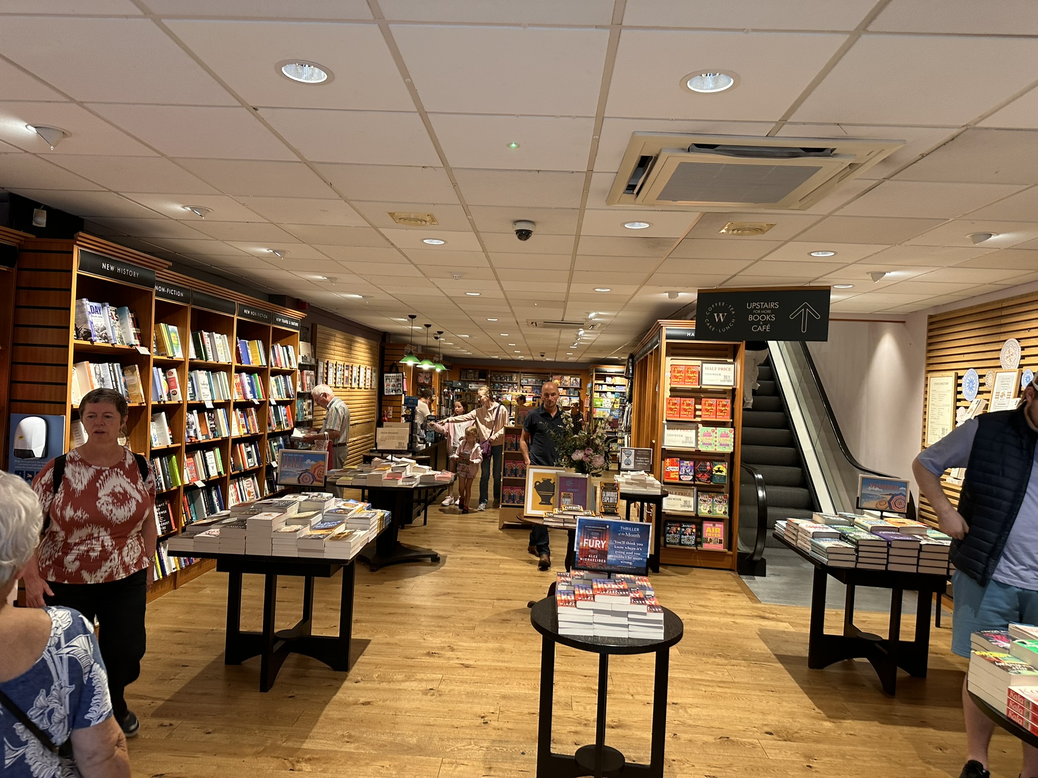 On entry from the street there is a narrow section in which we find new releases and books of local interest, along with some special offer tables. The escalator is to our right, the cash desk to the left (leaving quite a narrow section, especially if there is a queue for payment). The rest of the ground opens out to a wider area and contains all the gifts, toys and children books (a smart move since the rest of the store is hard to access with a pushchair or kids!)