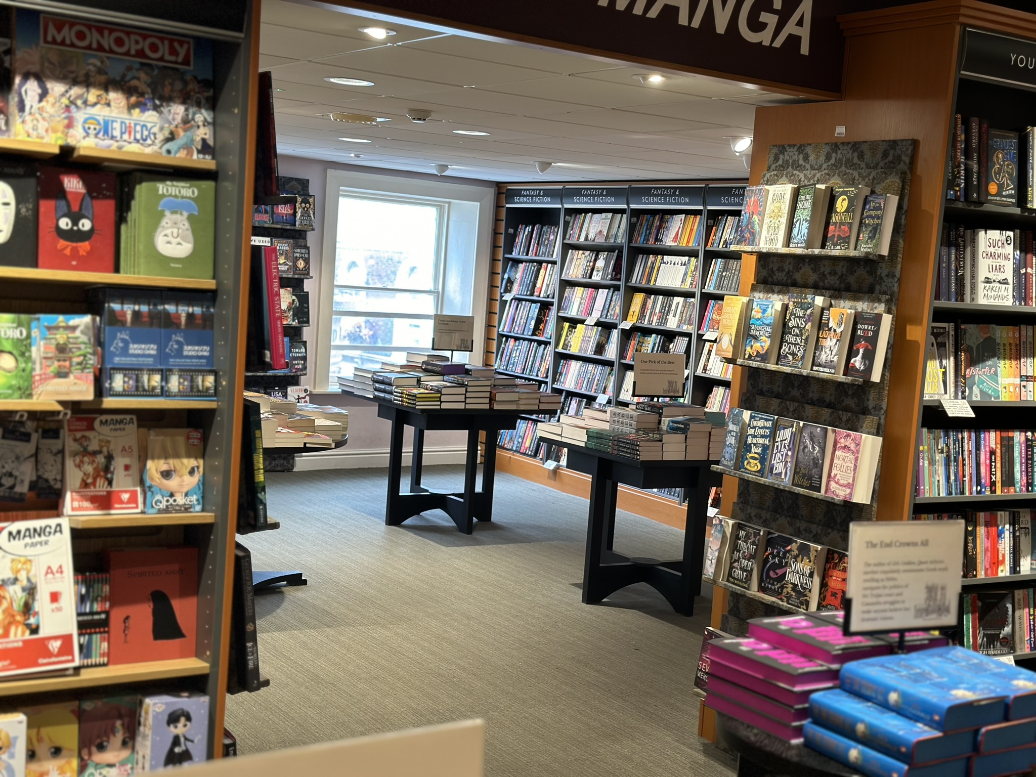 The second floor is almost entirely fiction, with just a few book stacks of reference, popular science and study guides that didn’t fit downstairs. There is a very extensive Science Fiction, Fantasy and Manga section, which is particularly well stocked (and popular with me). There’s also a large table available for study or board games (although the cafe hosts monthly games evenings too.)